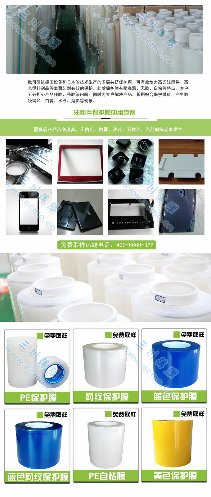 我司引進德國設備和日本的技術生產(chǎn)的多層共擠保護膜,可有效地為高光注塑件、高光塑料制品等表面起到有效的保護。此款保護膜有耐高溫、無膠、自粘等特點,客戶不必擔心產(chǎn)品殘膠、移膠等問題;同時為客戶解決產(chǎn)品,長期貼合保護膜后,產(chǎn)生的殘留如:白霧、水紋、鬼影等現(xiàn)象。